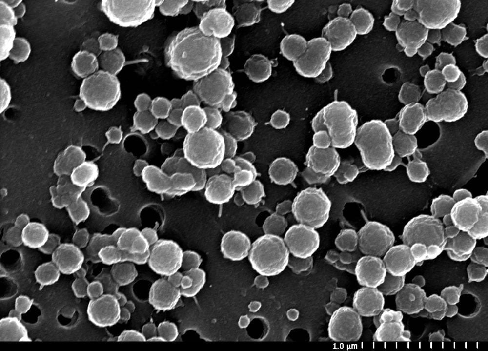 Imagen superior: la imagen muestra una micrografía electrónica de barrido muy pequeña (alrededor de 0,2 micras) y numerosas de células bacterianas encontradas habitando los canales helados de salmuera en el Lago Vida de la Antártida, que se encuentra en el valle Victoria, uno de los más septentrionales de los valles secos antárticos